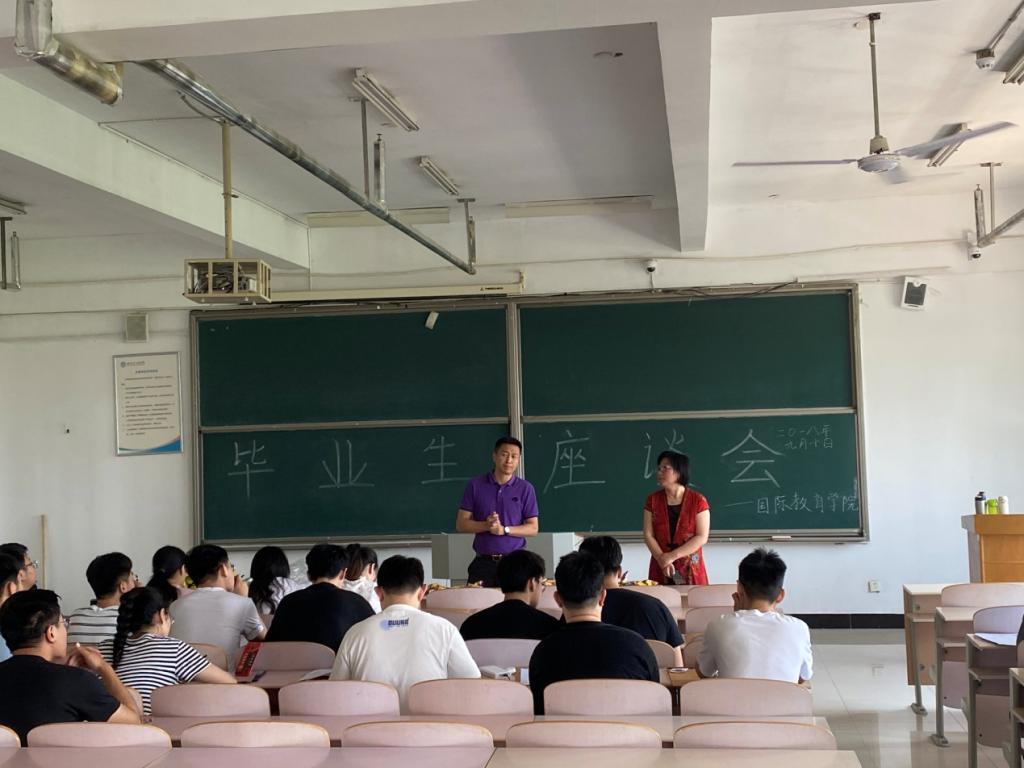 2021年6月8日上午在二教405教室,公海gh555000aa线路检测举办首届毕业生座谈会。公海gh555000aa线路检测成立于2017年,今年有首届毕业生。毕业生座谈会上,同学们表达了对母校的感恩之情以及毕业的不舍之意。国际教育公司党支部书记于丽方强调了同学们毕业前的安全问题,倡议大家文明离校,记得常回家看看。