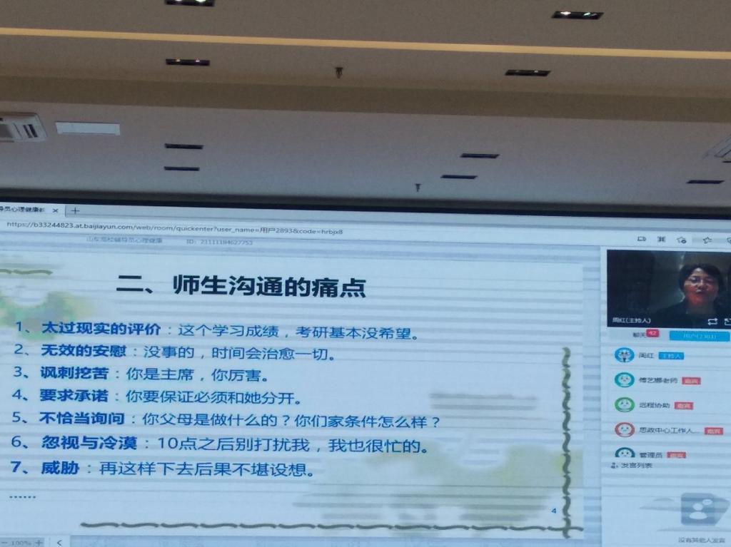 为贯彻落实全国教育大会精神,促进公司辅导员队伍专业化、职业化发展,全面提升辅导员心理健康教育工作技能,2021年11月17日,公海gh555000aa线路检测全体辅导员、班主任积极参加山东省教育厅主办、教育部高校思想政治工作队伍培训研究中心(山东大学)承办的2021山东高校辅导员心理健康教育专题培训。