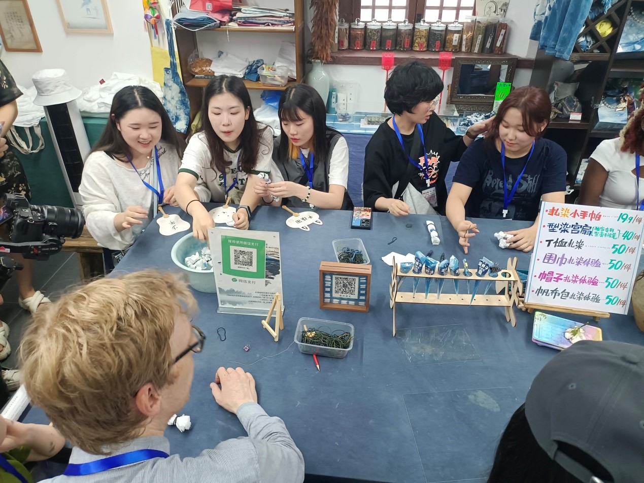 在扎染体验馆,扎染老师魏显勇向职工展示了成型的扎染艺术作品,并且详细讲解扎染的步骤、方法和技巧。职工充分发挥想象力,根据自身喜好的图案纹理将手中布料用线缠绕,经过设计、折叠、扎花、脱浆、染色、清洗等一系列步骤,染布逐渐成型。亲手制作的染布让国外友人们爱不释手,纷纷合照留念。
