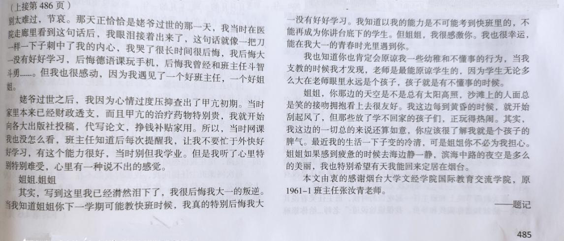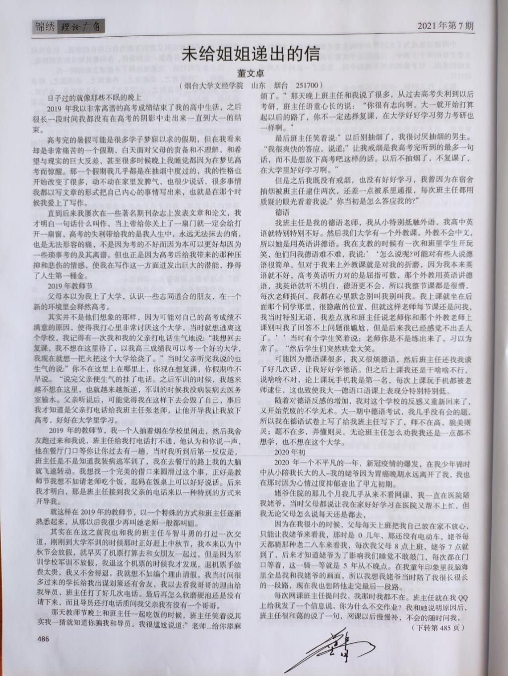 2021年3月,公海gh555000aa线路检测收到来自国家综合刊物《锦绣》上董文卓同学发表的《未给姐姐递出的信》,予以感谢我系国1961-1班主任张汝青老师在其学业和生活道路上的帮助。